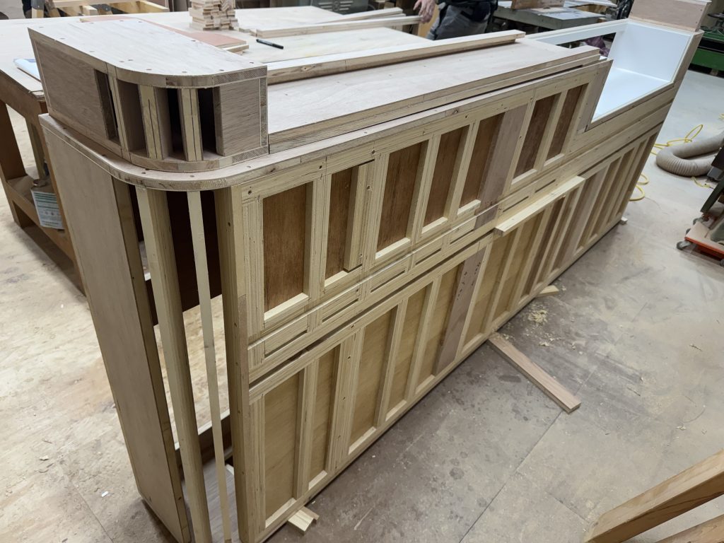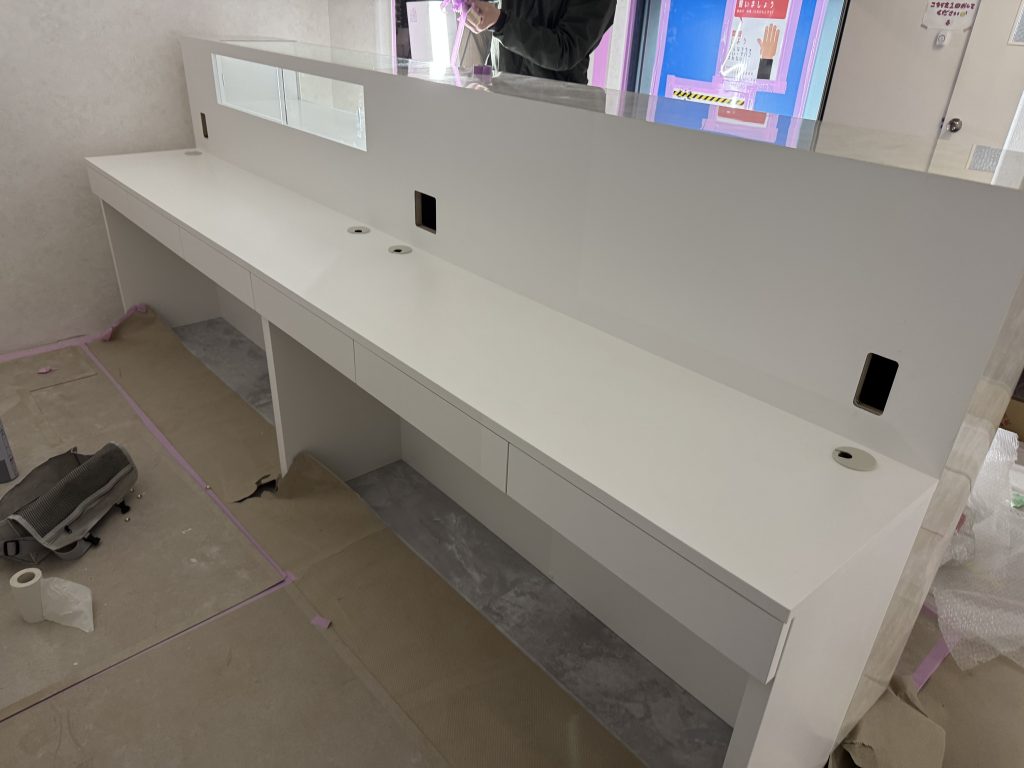 もう少し奇麗に撮れたらよいのですが、まだ大工さんなどもいてそうもいかない。 永く働いてくれることだろう。こちらも店舗系の家具一式。