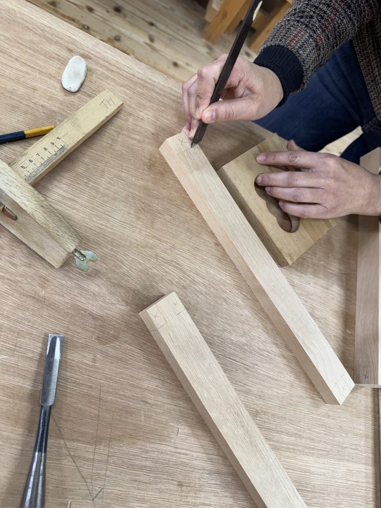 シラガキによる墨付け作業中、修行的ですがここに真髄があります。
