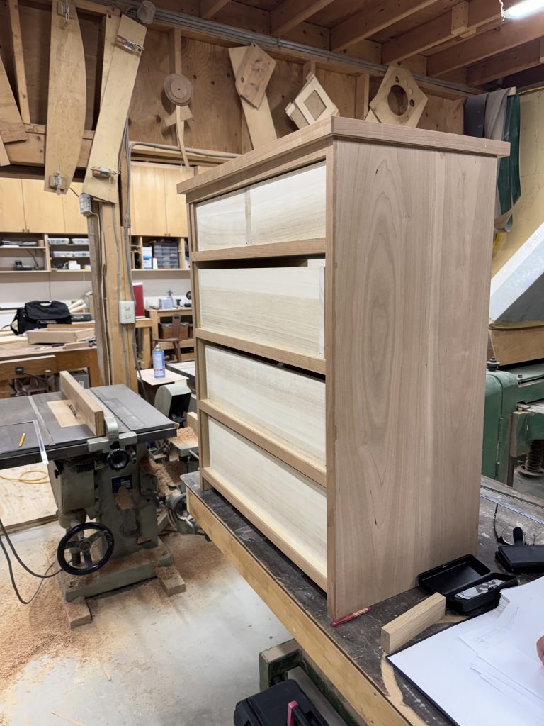 製作工程を簡単に説明すると、本体部の板を接ぎ、カットして接合部の加工を施し、それぞれの部材に鉋掛け。その後本体を組み立て、引き出しを作って摺動調整の後、開き扉製作。可動棚の棚ダボ孔加工と棚板の製作、それぞれに鉋掛け。 そして難易度の高い開き扉の平丁番取付とウォールナットのつまみを旋盤加工で製作取付、最後に塗装組み立て。 書くだけでも大変!