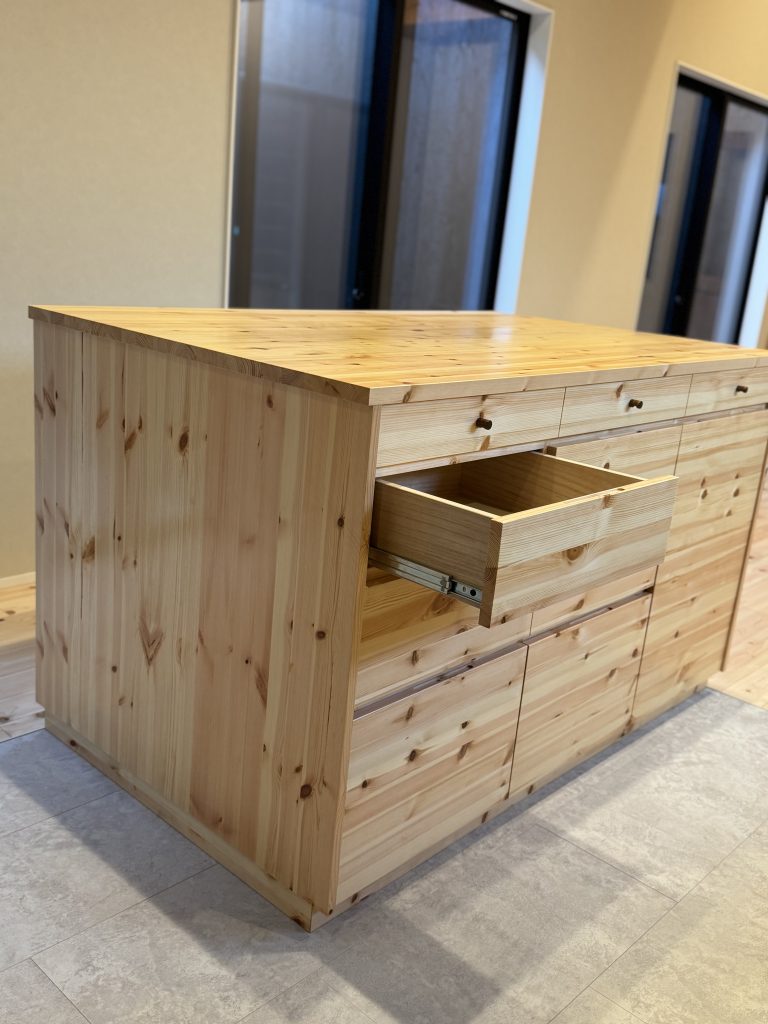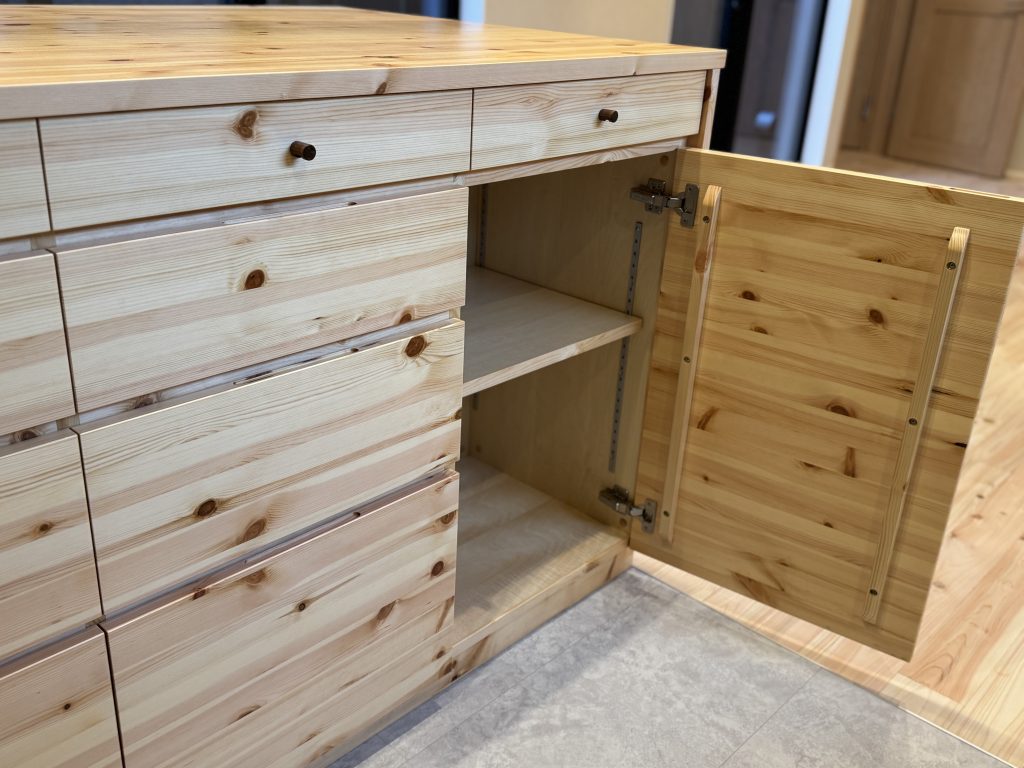 パイン材にも種類が色々とあって、こちらはヨーロピアンパイン。他にラジアータパインやメルクシパインなどありますが、やはりパインと言えばこのこのダイナミックな節のヨーロピアンパインです。ヒノキの床とも相性がよい。