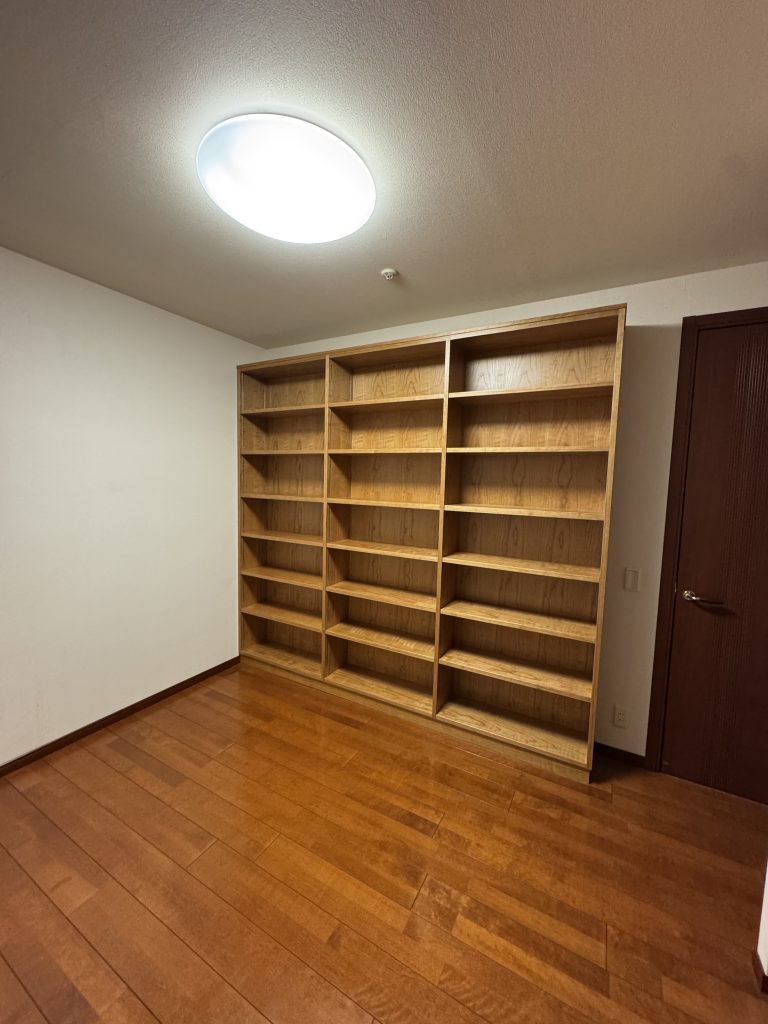 お部屋の床もブラックチェリーでした。本棚の方もこれから徐々に床と同じ濃いブラウンに変化していく事でしょう。