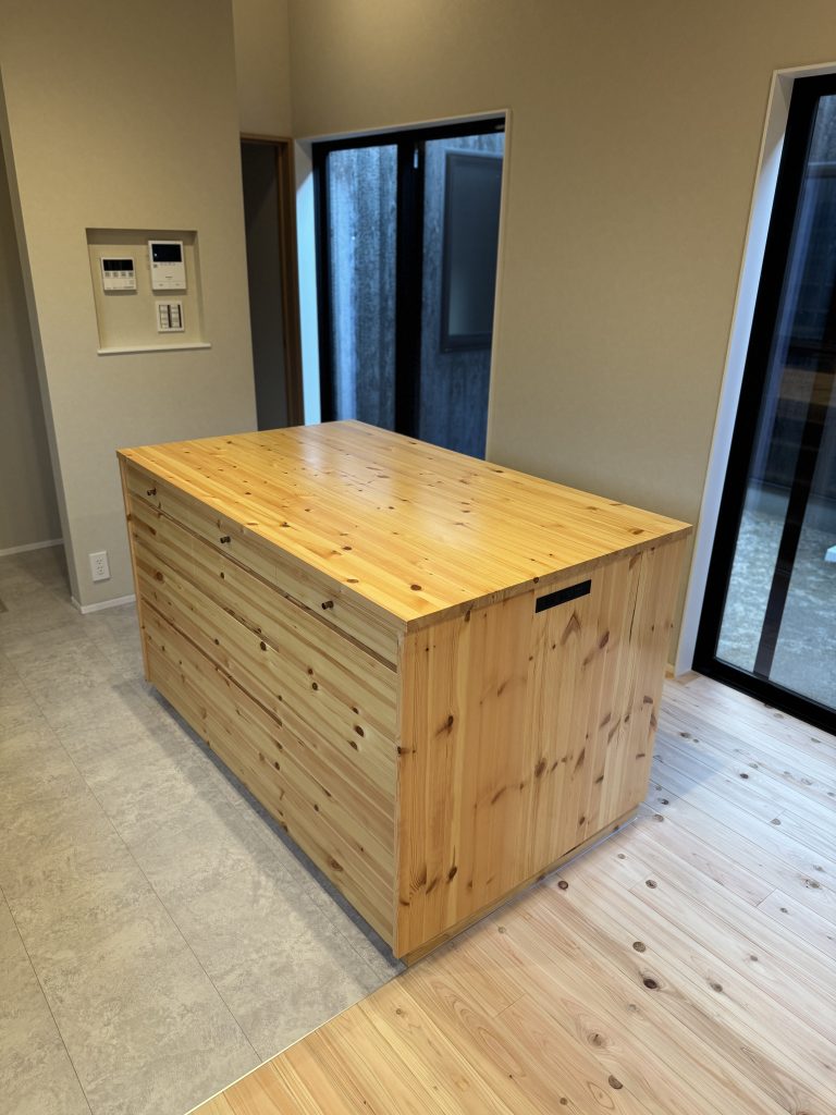 調理作業台型のキッチン収納。パイン材も素敵です。